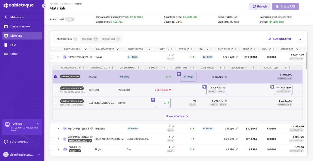Los fabricantes de ensambles de cable y arneses de alambres con frecuencia luchan con un proceso de cotización manual y que requiere mucho tiempo, lo que les evita ganar nuevos negocios. Muchos estimadores pasan horas recopilando costos de materiales, verificando la disponibilidad de existencias y reconciliando números de parte entre sistemas antes de que se pueda finalizar una cotización.