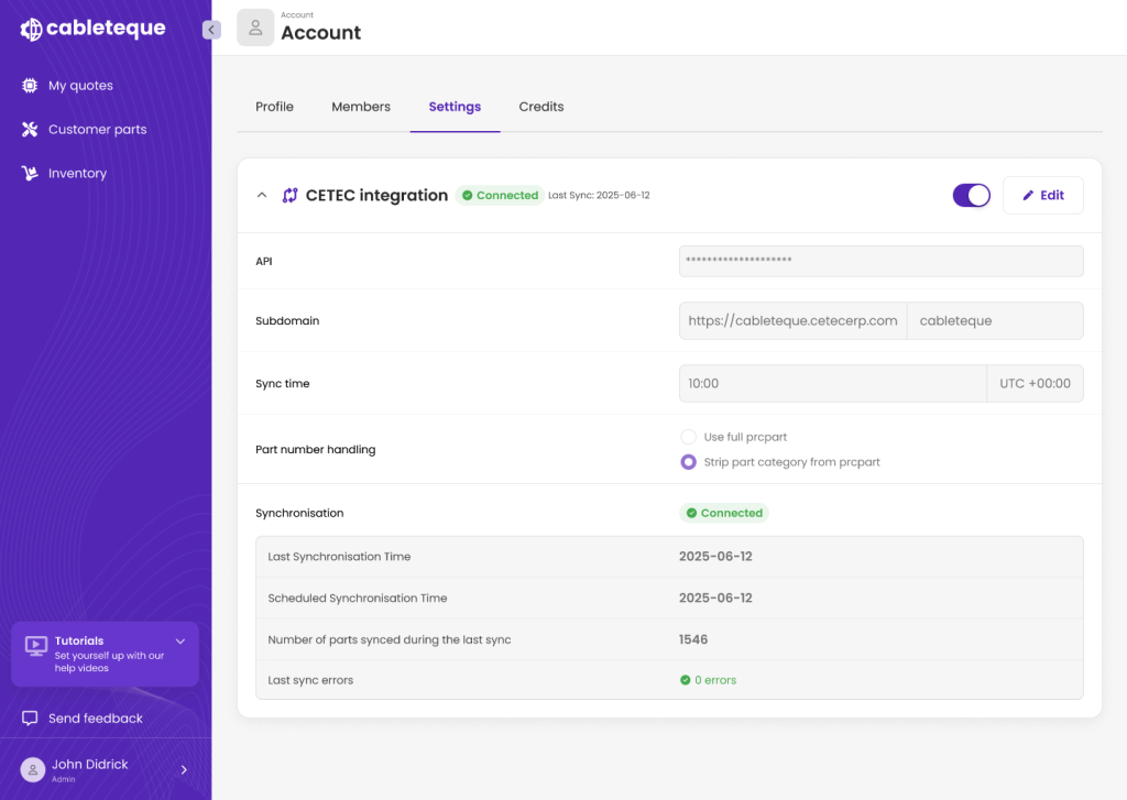 - Sincronización automatizada: Los números de parte del fabricante, los números de parte internos, los niveles de existencias no asignados y los costos del material se sincronizan automáticamente desde el Cetec ERP al Cableteque a través de API.
