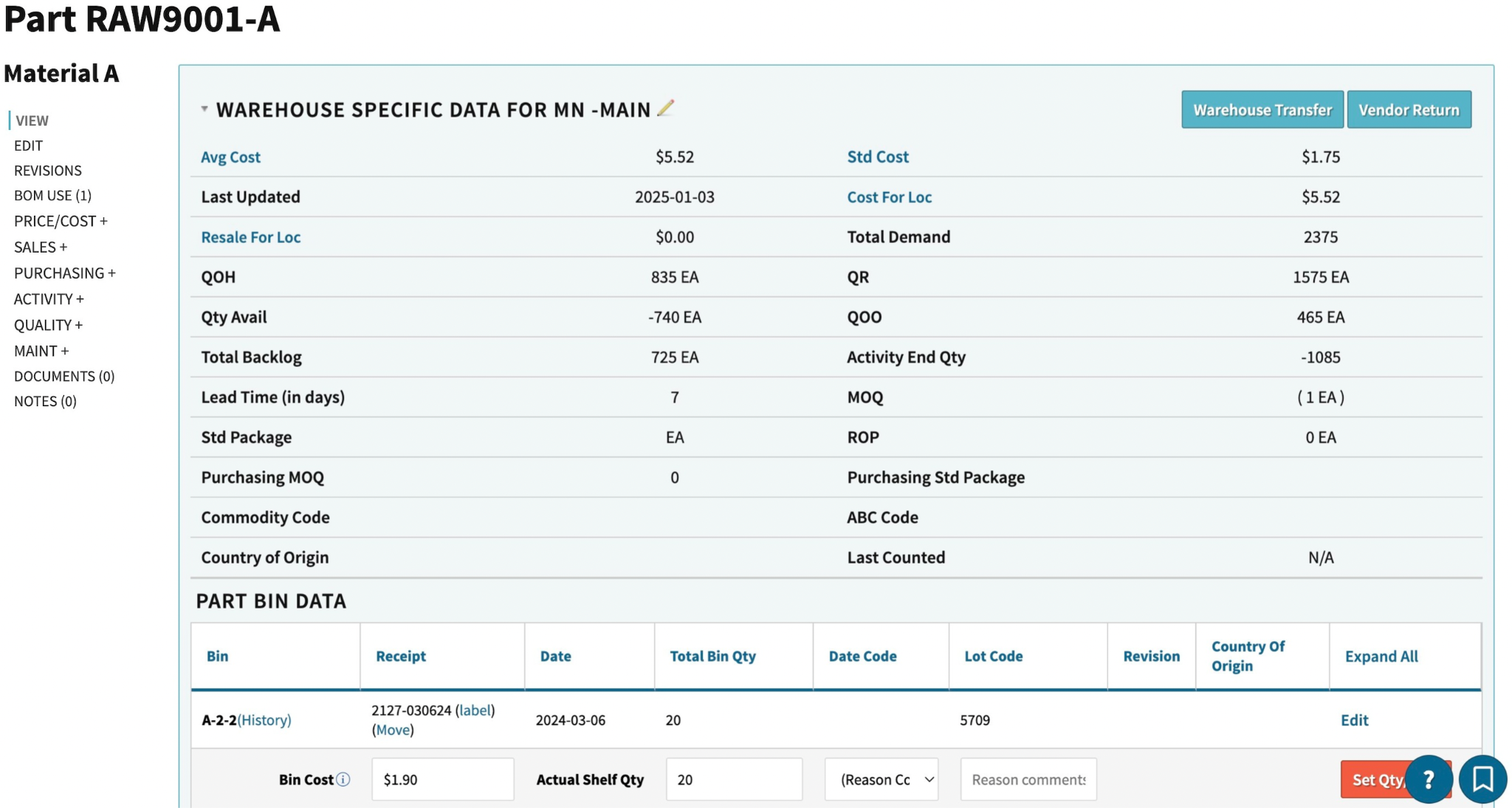 Figure 3: Imagen del Registro de Partes en Cetec ERP que muestra la disponibilidad del inventario, el costo, la ubicación del contenedor, junto con los datos y la actividad relacionados. (Fuente: Cableteque)